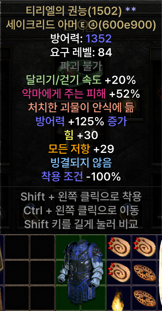 아머 | 방어력: 1322 - 1502 (기본 방어력: 487 - 600) 요구 레벨: 84 방어력 120-150% 증가 악마에게 주는 피해 +50-100% 달리기/걷기 속도 +20% 힘 +20-30 모든 저항 +20-30 빙결되지 않음 착용 조건 -100% 평화를 되찾기위해 몬스터들을 무찔러라 파괴되지 않음 |