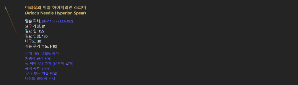 아리옥의 바늘을 아시나요? 4스킬과 준수한 데미지, 30% 공속 옵션 덕분에 일부 라스마들이 쓰기는 했지만 어디까지나 가성비 세팅이었고 별다른 쓸모는 없었다. 하지만 악마술사가 버려지던 이 아이템의 가치를 바꿔놨다. 4스킬과 무난한 증뎀은 메아리치는 타격에 제격인 옵션이고 내구도를 소모하지 않는 덕분에 에테로 나오는게 최상이다. 거기에 치명타도 50%나 붙어있어 치명타 세팅으로 가는 추세인 지금의 악마술사에겐 딱인 아이템 중에 하나다.